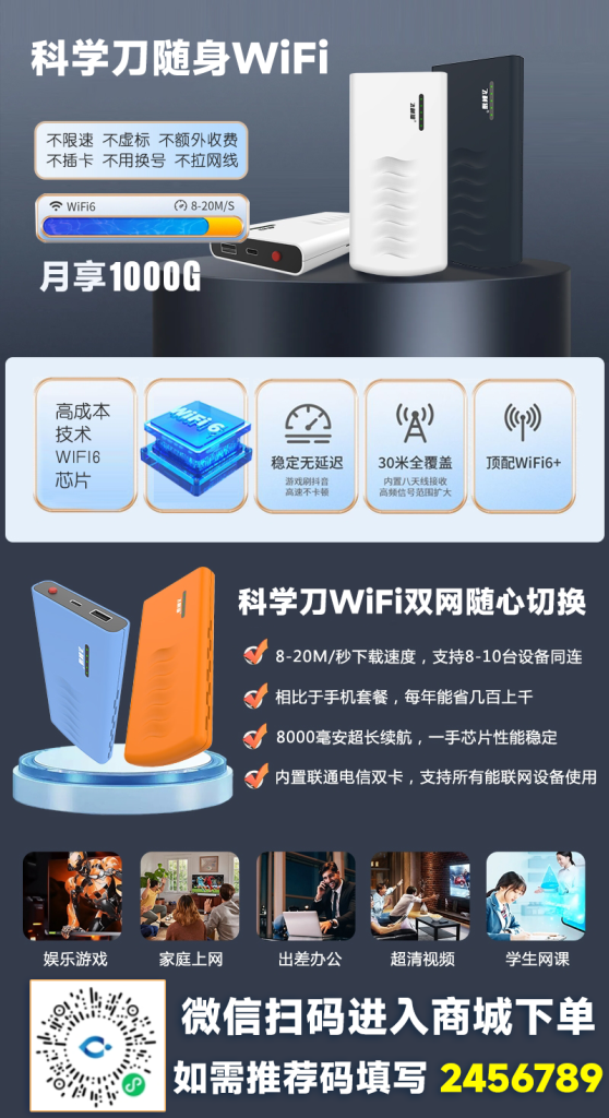 飞利猫品牌WiFi承诺 流量不虚量丨套餐真实永不涨价丨WiFi设备永不限速 低至9元1000G 98元包年 每月1000G 注:因运营商规则 电信封顶300G,剩余流量可用联通继续消耗 科学刀用户可直接威信扫码进去小程序商城 下单即可 如果下单需要填写推荐码 填写2456789 免费招收一级代 理 商https://tb3.cn/AVWb0x 点击链接加入 项目利润 长久分佣,客户充即拿提成,无需加盟费 结算方式 充值立结,商城客户下单即绑定,渠道、企业、个人均可合作